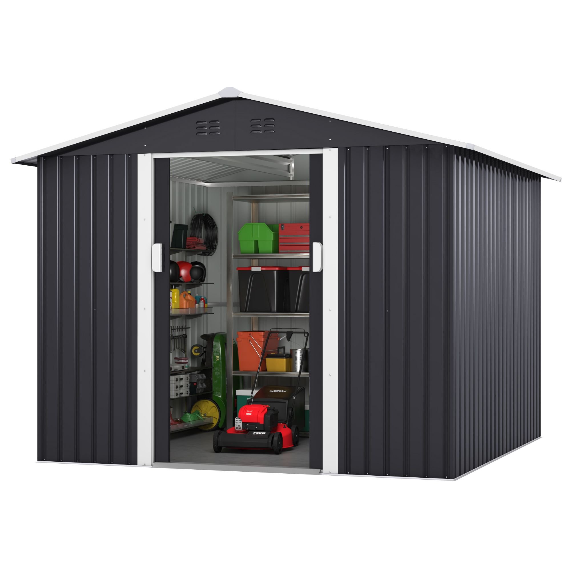 [8' x 8' Large Storage Shed]:This large yard shed provides extra outdoor storage space for organized storage of garden tools, lawn care equipment, pool supplies and other items. The large sliding door (37.40"W x 59.06"H) allow you to roll in bikes or roll out lawnmowers.
